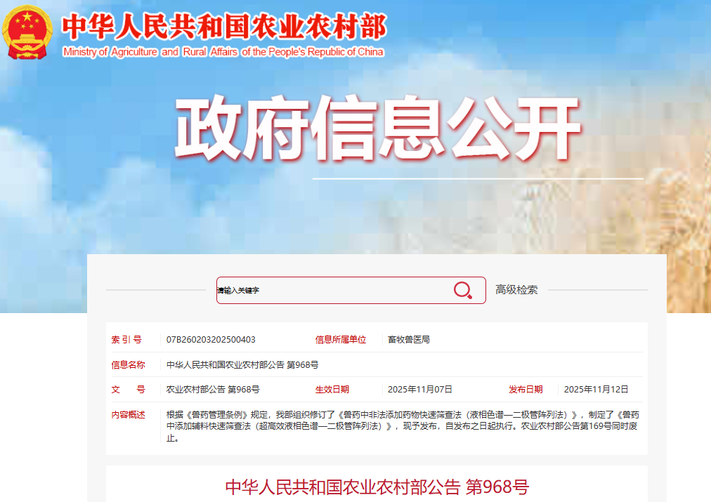 根据《兽药管理条例》规定,我部组织修订了《兽药中非法添加药物快速筛查法(液相色谱—二极管阵列法)》,制定了《兽药中添加辅料快速筛查法(超高效液相色谱—二极管阵列法)》,现予发布,自发布之日起执行。农业农村部公告第169号同时废止。