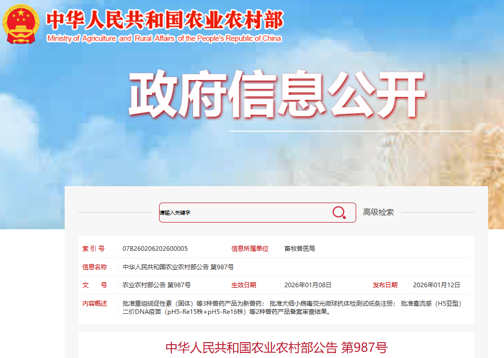 禽流感(H5亚型)二价DNA疫苗(pH5-Re15株+pH5-Re16株)等2种兽药产品,已通过农业农村部组织的生产毒种变更备案审查,发布有关疫苗产品的质量标准、工艺规程、说明书和标签,自发布之日起执行。
