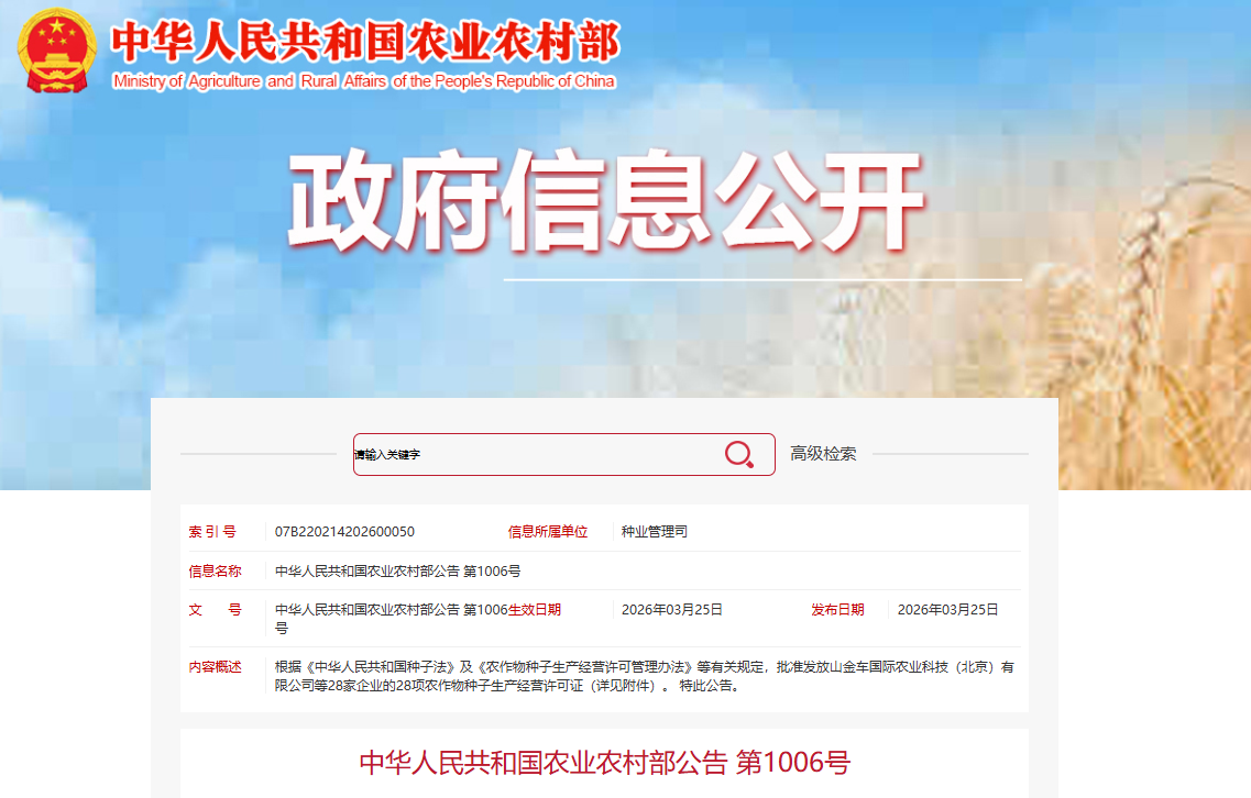 根据《中华人民共和国种子法》及《农作物种子生产经营许可管理办法》等有关规定,批准发放山金车国际农业科技(北京)有限公司等28家企业的28项农作物种子生产经营许可证(详见附件)。